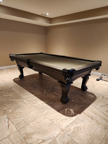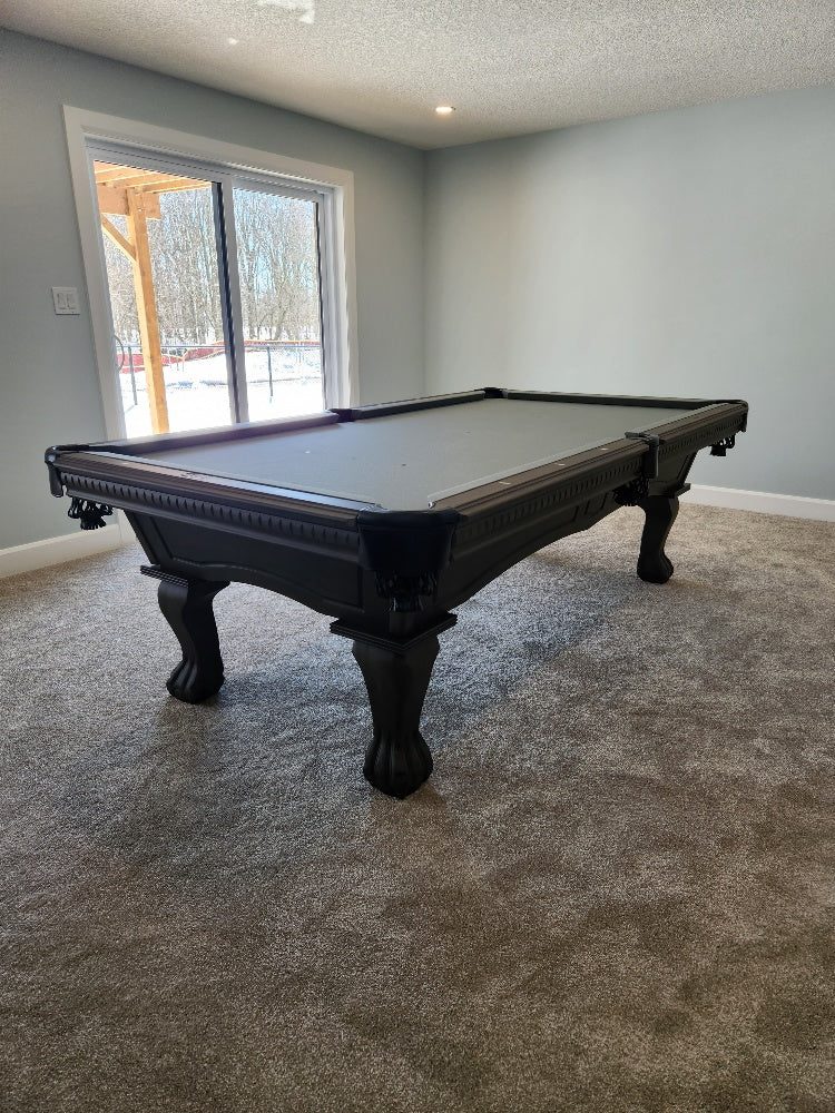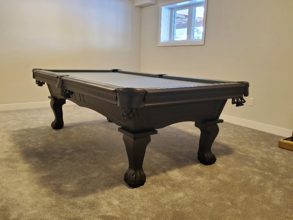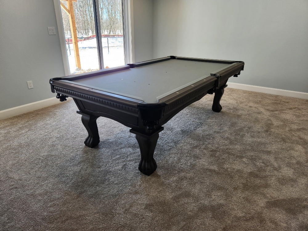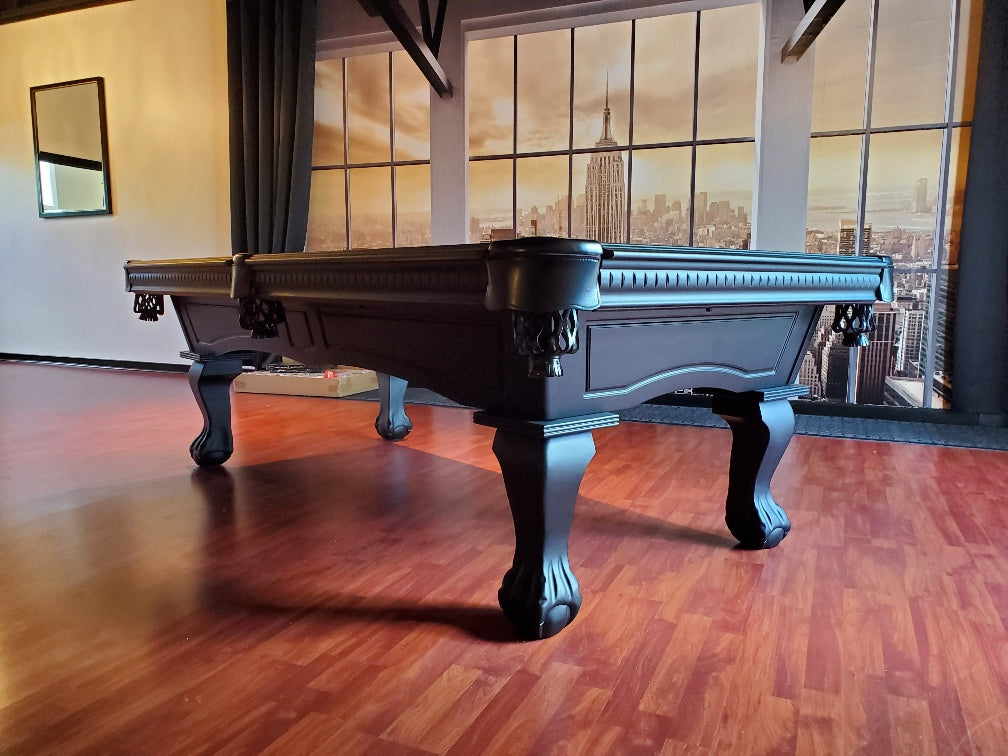 Majestic brand Pinnacle Walnut finish pool table with carved ball and claw leg style, 1 inch thick natural quarried slate, genuine leather pockets, European and North American solid wood construction, a 25 year manufacturer limited warranty and a choice of 24 Championship Invitational Teflon protected felt billiard cloth colors.
