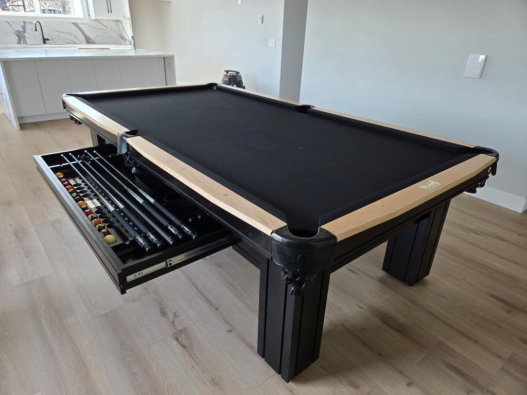 The Playmore Legend Billiard Table is a great addition to any family game room, business or recreation center. Made with solid rock hard Canadian maple rails with a 1.5 inch solid M.D.F ply cabinet. The table rails come pre covered and include a 21oz championship teflon coated cloth for fantastic play. The table is constructed with a simple and easy bolt up system for easy installation. The table comes with 1 inch 3 piece slate for superb playability. The Legend has a genuine leather pocket with a premium K55 bumper to provide accurate and perfect bounce every time. The square legs provide stability along with a modern look. This table is built for a lifetime of enjoyment for generations to come.