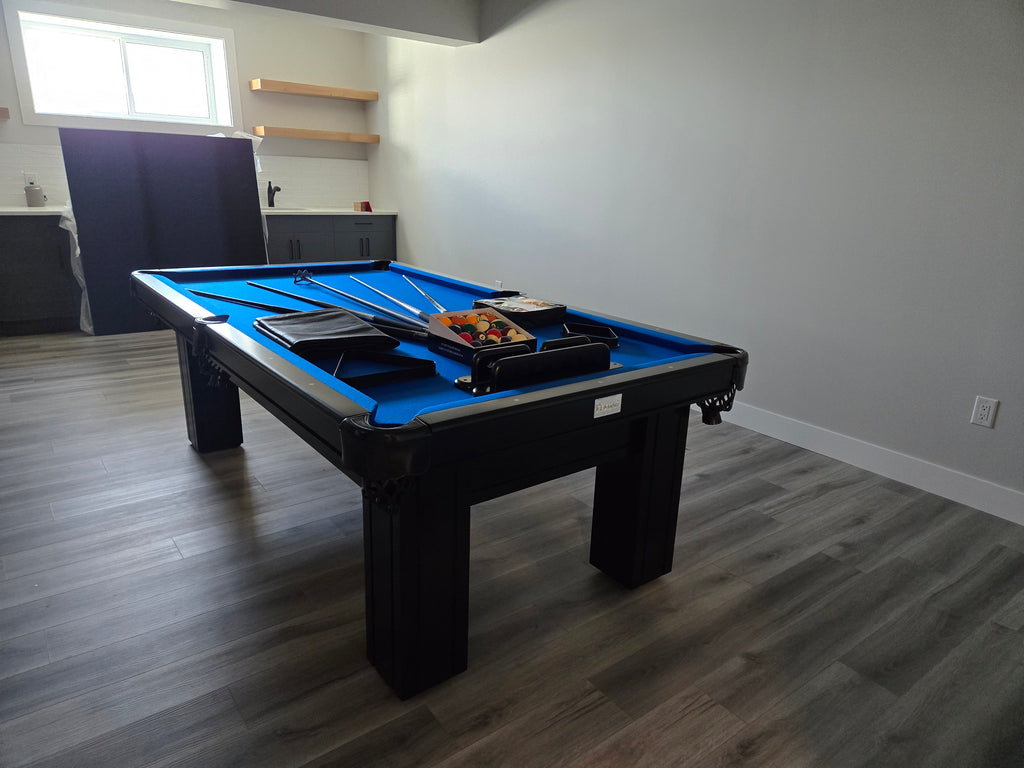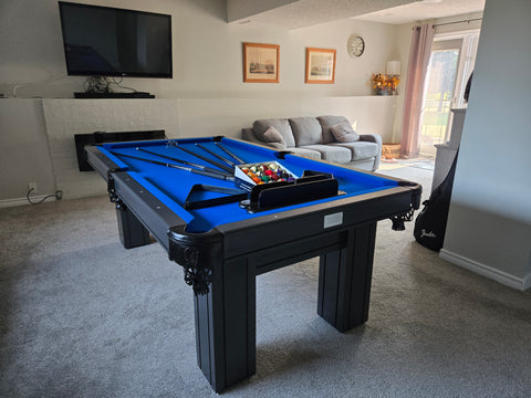 The Playmore Legend Billiard Table is a great addition to any family game room, business or recreation center. Made with solid rock hard Canadian maple rails with a 1.5 inch solid M.D.F ply cabinet. The table rails come pre covered and include a 21oz championship teflon coated cloth for fantastic play. The table is constructed with a simple and easy bolt up system for easy installation. The table comes with 1 inch 3 piece slate for superb playability. The Legend has a genuine leather pocket with a premium K55 bumper to provide accurate and perfect bounce every time. The square legs provide stability along with a modern look. This table is built for a lifetime of enjoyment for generations to come.