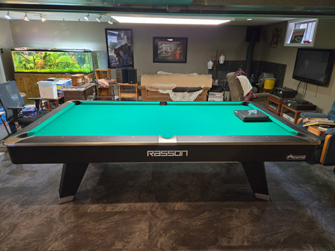 Rasson Acurra professional competition 9 foot pool table. Made with solid hardwood and black HPL composite outer surface, highly resistant to water, fire and scratches. Includes a choice of 24 Championship Invitational Teflon protected felt billiard cloth colours. Also available in 8 foot oversized format ( see stores for details ) and with or without automatic ball return. Add $100 for ball return option. Please note that the ball return option is only available on the 9 foot format table, and not on the 8 foot model.• K55 Tournament profile rubber rails